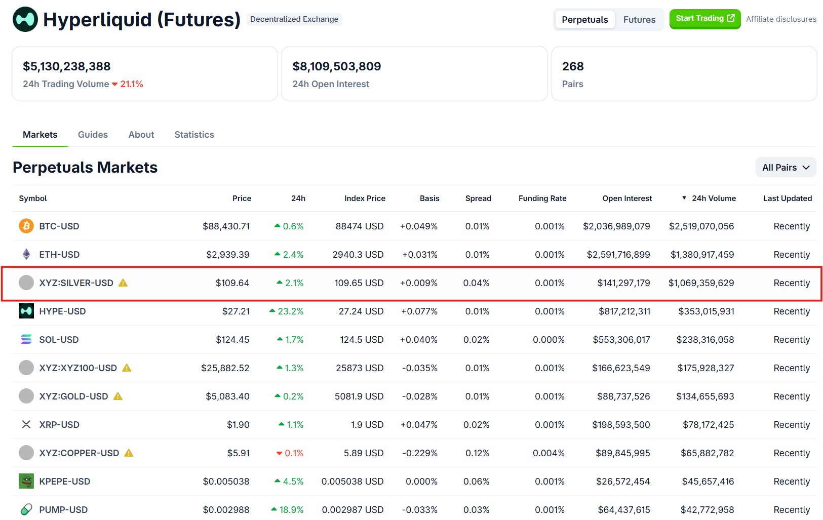 A Hyperliquid decentralizált derivatívapiacán a SILVER–USDC örök határidős kontraktus az ázsiai kereskedési időszakban nagyjából 110 dolláros árfolyamon forgott. A 24 órás forgalom pedig átlépte az 1 milliárd dollárt, ami a platform egyik legaktívabb piacává tette az ezüstöt. A CoinGecko adatai szerint volumenben már csak a bitcoin