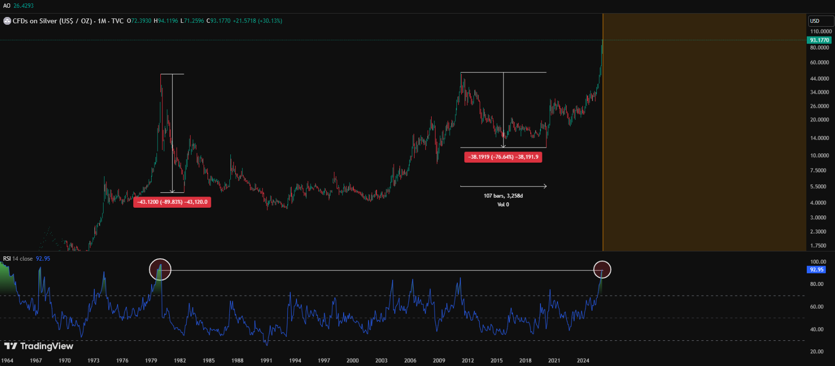 A csatolt grafikonon jól látszik, hogy az ezüst hasonló parabolikus felfutást produkált, mint az 1980-as évek elején, valamint 2015-ben. A havi grafikonon jól látszik, hogy a relatív erősségindex (RSI) jelenleg 93 közelében található, vagyis az árfolyam messze túlértékelt, és akár egy 70-80%-os eséssel is reagálhat, amennyiben követi azt a mintázatot, amelyre a történelemben már többször is volt példa.