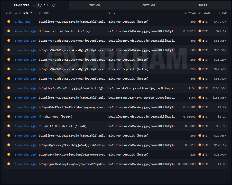 A legutóbbi mozgás csupán egy nappal ezelőtt történt, amikor a tárca újabb 500 bitcoint utalt át a Binance-re. Ez a csomag jelenlegi árfolyamon körülbelül 47,8 millió dollárt (~15 milliárd forintot) ér, és egy újabb állomása a több hónapja tartó értékesítési folyamatnak.
