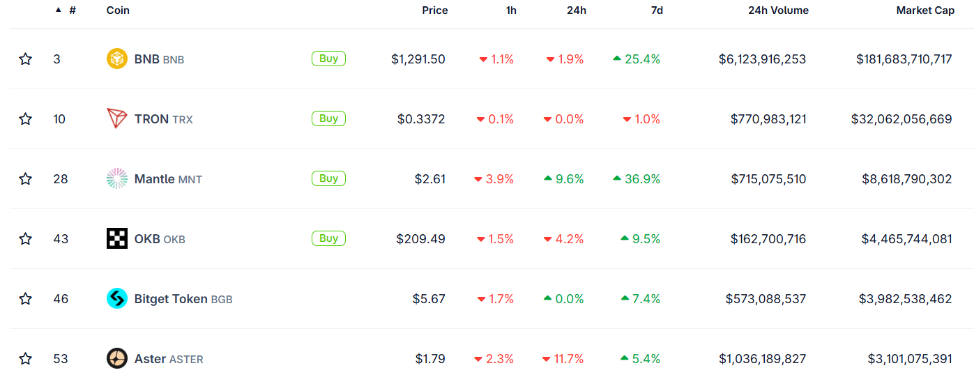 Emelkedés tekintetében szorosan jött az MNT mögött a BNB. Ez a coin 25%-ot emelkedett árfolyamában az utóbbi hét napban, most 1297 dolláron kereskednek vele, ami nincs messze az 1330 dolláros történelmi csúcsától. Az emelkedés a BNB piaci kapitalizációját 182 milliárd dollár közelébe emelte, ezzel pedig a harmadik legnagyobb kriptovalutává lépett elő piaci kapitalizáció alapján. Szakértők szerint a szélesebb körű emelkedést mind a narratíva, mind a tőke táplálja – ideértve a Binance Smart Chain (BSC) növekvő aktivitását és az olyan tokenek közelmúltbeli bevezetését, mint az STBL és az Aster.