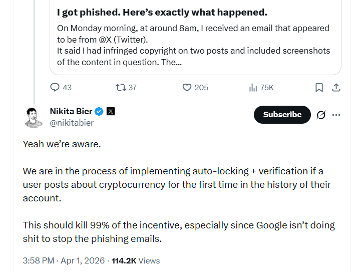 Elon Musk közösségi platformja, az X változtatásokat vezet be, hogy visszaszorítsa a kriptós csalásokat, amelyek hosszú ideje elárasztják az oldalt. Nikita Bier, az X termékigazgatója arról írt nemrégiben egy feltört fiókja miatt panaszkodó felhasználónak, hogy automatikus zárolást és ellenőrzést terveznek olyan esetekre, amikor például valaki először posztol kriptovalutáról a fiókja történetében. Bier azt is írta, hogy szerintük ez megszüntetné a csalások 99%-át, főleg, hogy a Google semmit nem tesz a phishing e-mailek megállításáért.