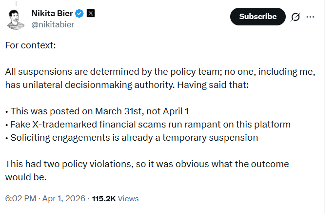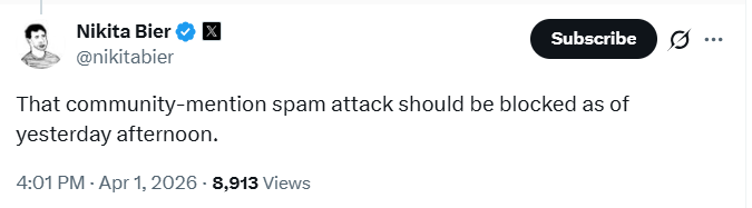 Ettől függetlenül kérdések azért felmerülnek. Április elsején közzétett posztjában Bier azt írta, hogy ha 10 ezernél több követője van valakinek és mindenféle előzmény nélkül mémcoinokról posztol valaki, az mindig csalás. A kérdés az, hogy hogyan fogja a funkció ellenőrizni a kriptós tartalmak legitimitását olyan fiókok esetében, amelyek először posztolnak erről, de szándékosan és legális, normális célból.