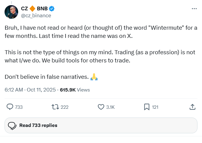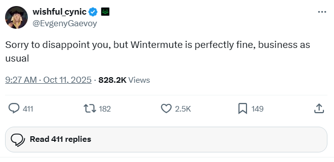 Jevgenyij Gaevoj, a Wintermute társalapítója és vezérigazgatója nyilvánosan cáfolta a szombat kora reggel terjedő pletykákat, amelyek szerint az október 10-i hirtelen bekövetkezett piaci esés a market maker cégének pozícióját is megrogyasztotta. Egy X-en megjelent bejegyzésében Gaevoy ragaszkodott ahhoz, hogy a „szokásos üzletmenet” folytatódik, és hogy a Wintermute „teljesen jól van”, közvetlenül reagálva a közösségi médiában megjelent hírek özönére, amelyek azt állították, hogy a likvidációk mértéke megreccsentette a céget.