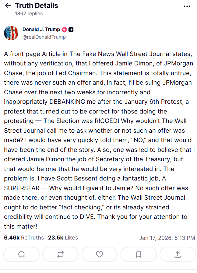 Trump jogi perrel való fenyegetését a JPMorgan ellen pont akkor húzta elő, amikor az elnök ugyanabban a Truth Social-bejegyzésben cáfolta a Wall Street Journal szerdai cikkjét, amely szerint az elnök hónapokkal ezelőtt, egy fehér házi találkozón felajánlotta Jamie Dimonnak, a JPMorgan vezérigazgatójának a Federal Reserve elnöki posztját. A Journal riportja szerint Dimon viccnek vette a javaslatot.