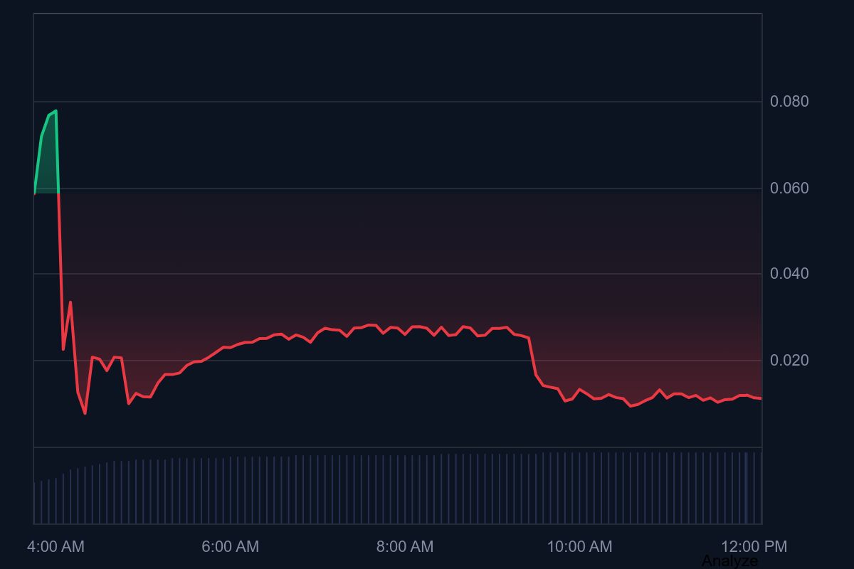Az eufória azonban nem tartott sokáig. A friss árfolyamgrafikon alapján jól látszik, hogy az esti órákban kialakult csúcs után az árfolyam gyorsan visszafordult, és jelentős esést szenvedett el. A korábbi nyereség nagy része elolvadt, miközben a volatilitás extrém maradt. Ez a mozgás klasszikus „pump and fade” mintázatot mutat: gyors felrántás, vékony likviditás mellett, majd hirtelen lejtmenet, amikor a korai vásárlók realizálnak, az új belépők pedig bent ragadnak.