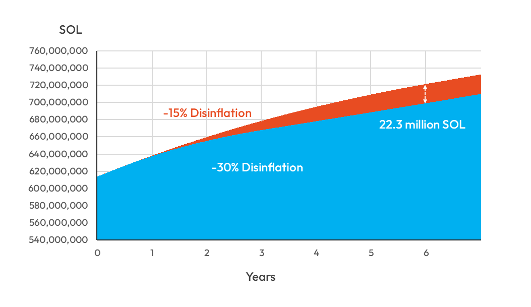 A javaslat lényege, hogy a Solana jelenlegi éves dezinflációs ütemét, amely most 15%, jelentősen megemelnék, egészen 30%-ig. Ez gyakorlatban azt jelentené, hogy a hálózat jóval gyorsabban közelítene a végső, 1,5%-os inflációs szinthez. Az eredeti menetrend szerint ehhez nagyjából hat évre lett volna szükség, de az új terv mindezt három évre rövidítené. A módosítás hatása igencsak jelentős lenne, a következő hat évben összesen mintegy 22,3 millió SOL-token kibocsátását kerülné el a hálózat, ez jelenlegi árfolyamon nagyjából 3 milliárd dollárnak felel meg.