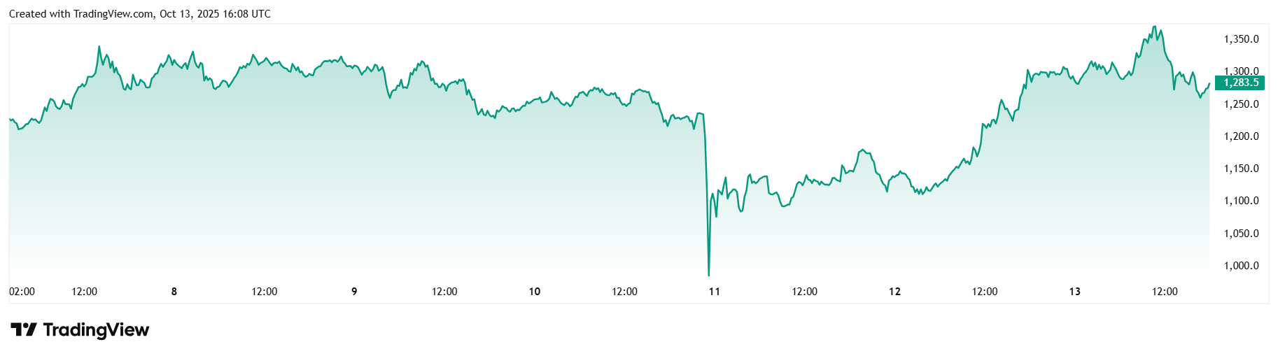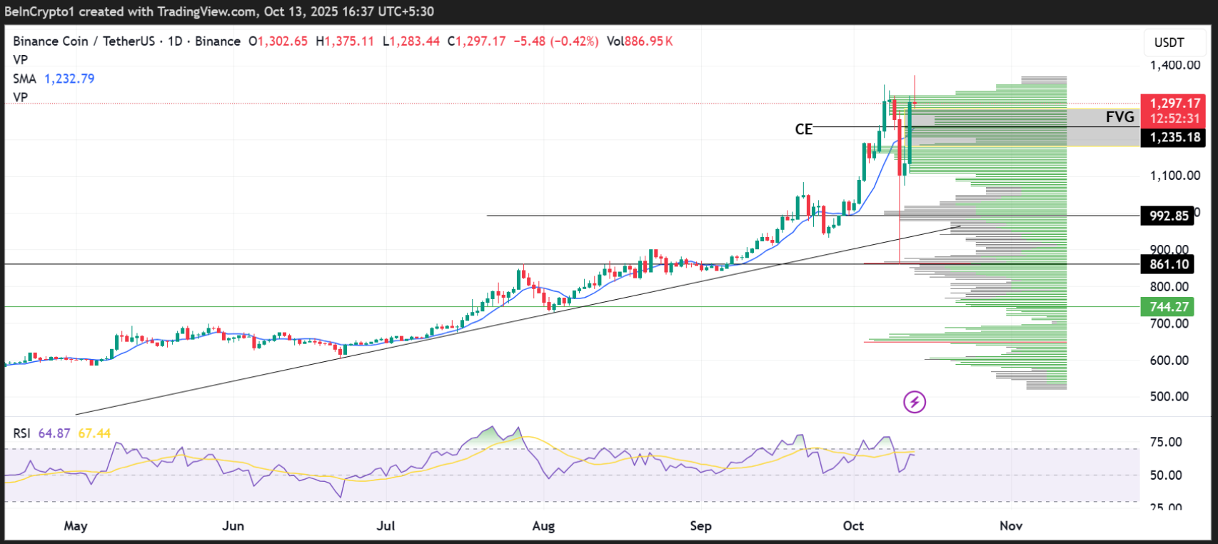 Az egyszerű mozgóátlag (SMA) 1223 dolláron adja a támasztási szintet, a 62,9-es RSI mutató pedig emelkedő lendületet jelez. A coin emelkedő trendben van, még nem túlvett, de közeledik a 70-es szinthez, ahol már sokan óvatosabbá válnak. Ez az érték pozitív momentumot jelez, de még nem túl extrém – tehát további emelkedés is lehetséges, mielőtt korrekció jönne. A BNB ára azonban a következő emelkedés előtt korrekcióra is számíthat. Az október 12-i hirtelen emelkedés után az ár egy hatékonysági vagy egyensúlyhiányt (FVG vagy fair value gap) hagyott maga után, amelyet ki kell pótolni. Ez az FVG 1182 és 1283 dollár között van. Az FVG akkor jön létre, amikor az árfolyam hirtelen elmozdul, és nem tölt ki bizonyos gyertyák közötti hézagokat – ezeket a piaci egyensúly hiányának értelmezik.