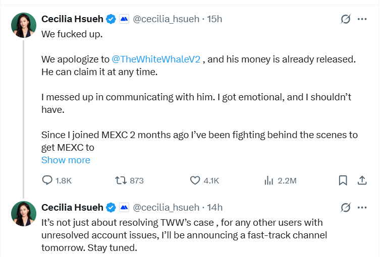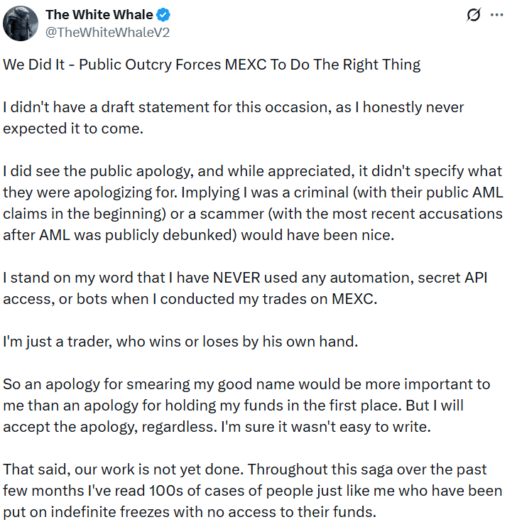 A bálna visszautasította a vádakat és azóta médiakampányt folytatott, hogy visszakapja a pénzét. Ebben nemrég még az ismert blokklánc-elemző, ZachXBT is mellé állt. A kereskedő és a MEXC közötti nyilvános vita után végül nemrégiben a tőzsde megadta magát. Cecilia Hsueh, a MEXC biztonsági vezetője egy X-en közzétett posztban írt arról, hogy elnézést érnek a bálnától és visszaadják a pénzét. Hozzátette azt is, hogy az incidens eredményeként most a MEXC egy ún. gyorsított csatorna létrehozásán dolgozik a megoldatlan fiókproblémák kijavítására.