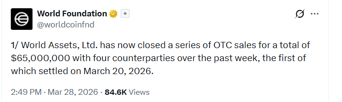 A Sam Altman nevéhez is köthető Worldcoin (újabban „World”) hálózat irányításáért, fejlesztéséért és fenntarthatóságáért felelős World Foundation tokenkibocsátó leányvállalata, a World Assets nemrégiben 65 millió dollár értékű WLD‑token értékesítését bonyolította le négy partnerrel tőzsdén kívül teljesen privát üzletben. A március 28-án, az X-en tett bejelentés szerint az értékesítések az elmúlt héten zajlottak, az első elszámolás március 20-án történt. A World Foundation szerint az ügyletek átlagára körülbelül 0,2719 dollár volt tokenenként, ami összesen nagyjából 239 millió eladott WLD-t jelent.