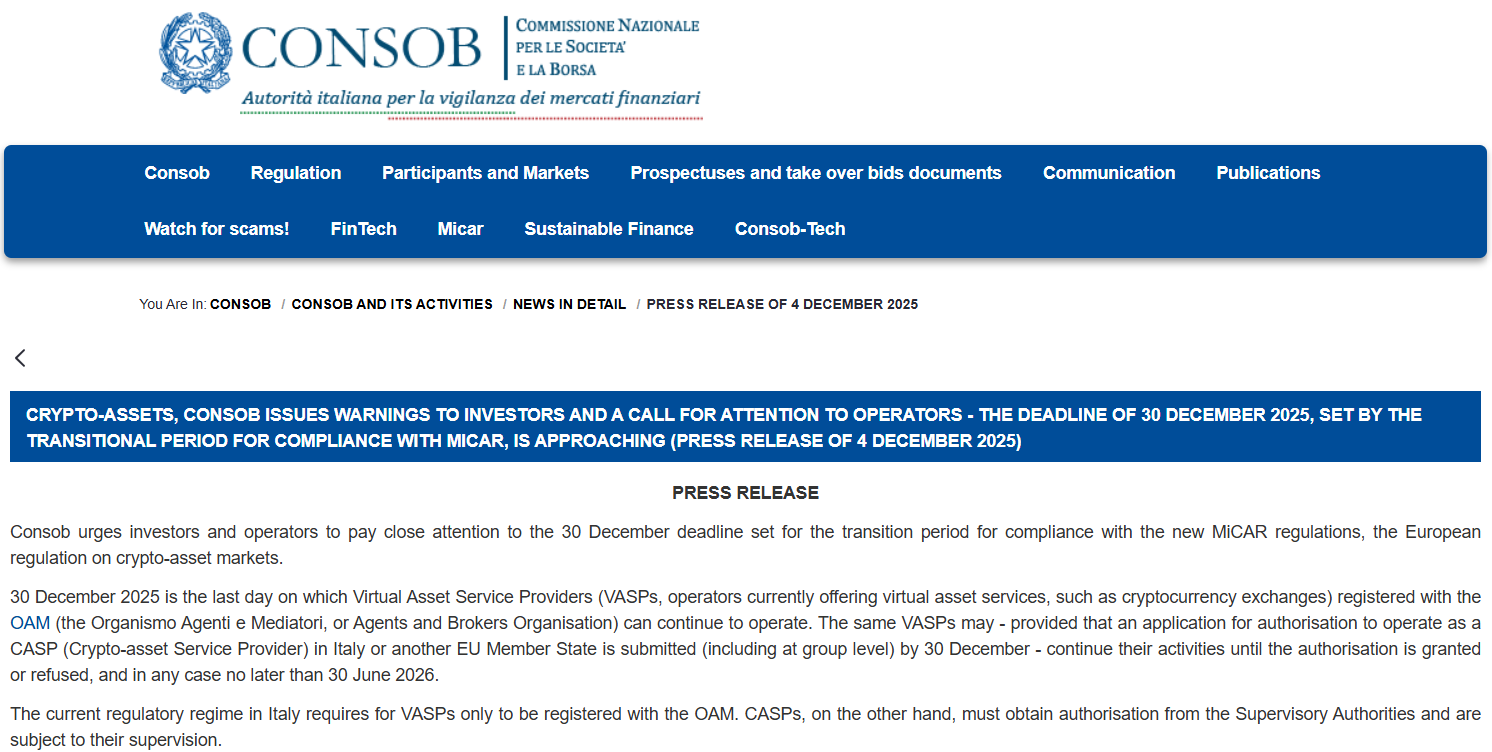 Olaszország pénzügyi felügyelete nemrégiben felszólította a kriptoszolgáltatókat, hogy december 30-ig szerezzék meg (de legalábbis kérelmezzék) az EU új, MiCA-szabályozás szerinti engedélyt, ellenkező esetben meg kell szüntetniük a tevékenységüket. Ezzel növekszik a nyomás a helyi felhasználókat kiszolgáló kriptoszolgáltatókon, tőzsdéken. A Consob, az ország pézügyi felügyeleti hatósága egyben figyelmeztette a befektetőket és az üzemeltetőket is, hogy maximális figyelemmel járjanak el, ahogy az EU kriptoeszközökkel kapcsolatos szabályozásának átmeneti időszaka a végéhez közeledik.