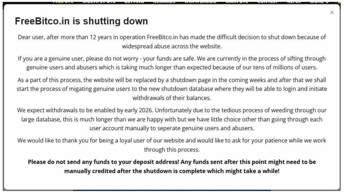 2025 közepétől egyre több felhasználó jelentett hetek, majd hónapok óta „pending” státuszú kifizetéseket, eltűnő ügyfélszolgálatot és válasz nélküli ticketeket, miközben az oldal továbbra is fogadott új befizetéseket és futtatta a lottókat. A decemberi közleményben a FreeBitco.in bejelentette, hogy „shutting down”, a kifizetéseket 2026 kezdetére ígérik visszakapcsolni, és azt állítja, hogy a több millió számla kézi átvizsgálása zajlik a „rendes felhasználók” és „csalók/farmerek” szétválasztására – kritikus elemzések szerint ez valójában egy határozatlan idejű befagyasztás, exit scam-szerű koreográfiával.