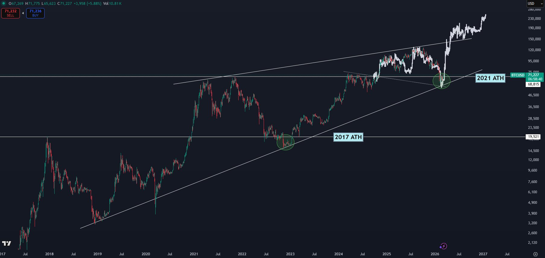 A bitcoin technikai elemzése évek távlatában, forrás: X/Kaleo