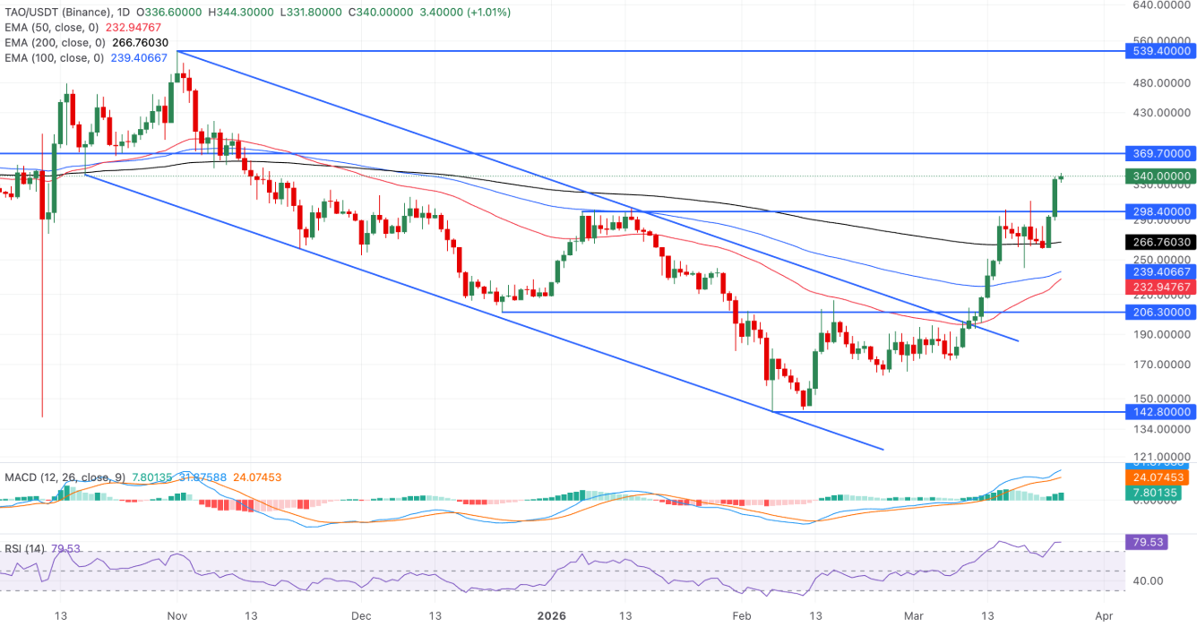 Sokadik napja az AI-kriptovaluták azok, amelyek a piacot húzzák: a CoinMarketCap adatai szerint az elmúlt 24 óra legjobban teljesítő altcoinja a Bittensor volt, melynek TAO tokenje több mint 10%-ot erősödve megközelítette a 350 dolláros árfolyamot. A TAO eltávolodott az 50-, a 100-, és a 200 napos exponenciális mozgóátlagától is, a kitörés pedig akár 370 dollárig is tarthat – ezt a novemberben felállított 540 dolláros szint követheti, ha a piaci helyzet úgy alakul.