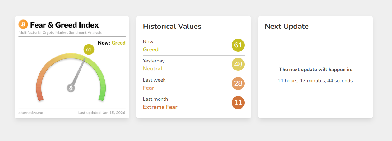 A kriptopiaci hangulatot mérő úgynevezett Crypto Fear & Greed Index nemrégiben átlépett egy fontos mércét. A kapzsiság, azaz greed szintre ugrott, ami először fordult elő tavaly október óta. Az index 61 pontot ért el, miután heteken át a félelem vagy extrém félelem szinten állt, ami a piac széleskörű pesszimizmusát jelezte. Az ezzel kapcsolatos hangulatjavulás hátterében részben a bitcoin árfolyamának erősödése áll.