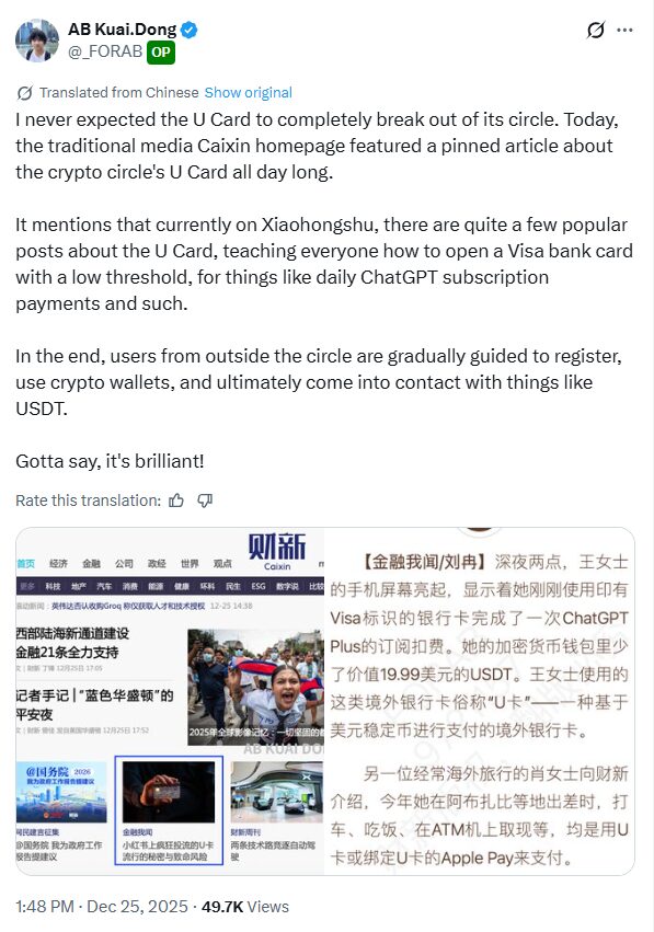 A Kína által engedélyezett „U-kártya” nem más, mint egy külföldi Visa, vagy Mastercard-típusú kártya, amelyet stabilcoin-egyenleggel lehet feltölteni. A felhasználó dollárban denominált kriptovalutákat utalnak el egy háttérben működő szolgáltatónak, akik ezt azonnal fiat valutává alakítják át, ami már felhasználható a hagyományos pénzügyi rendszerben a kártyák által.