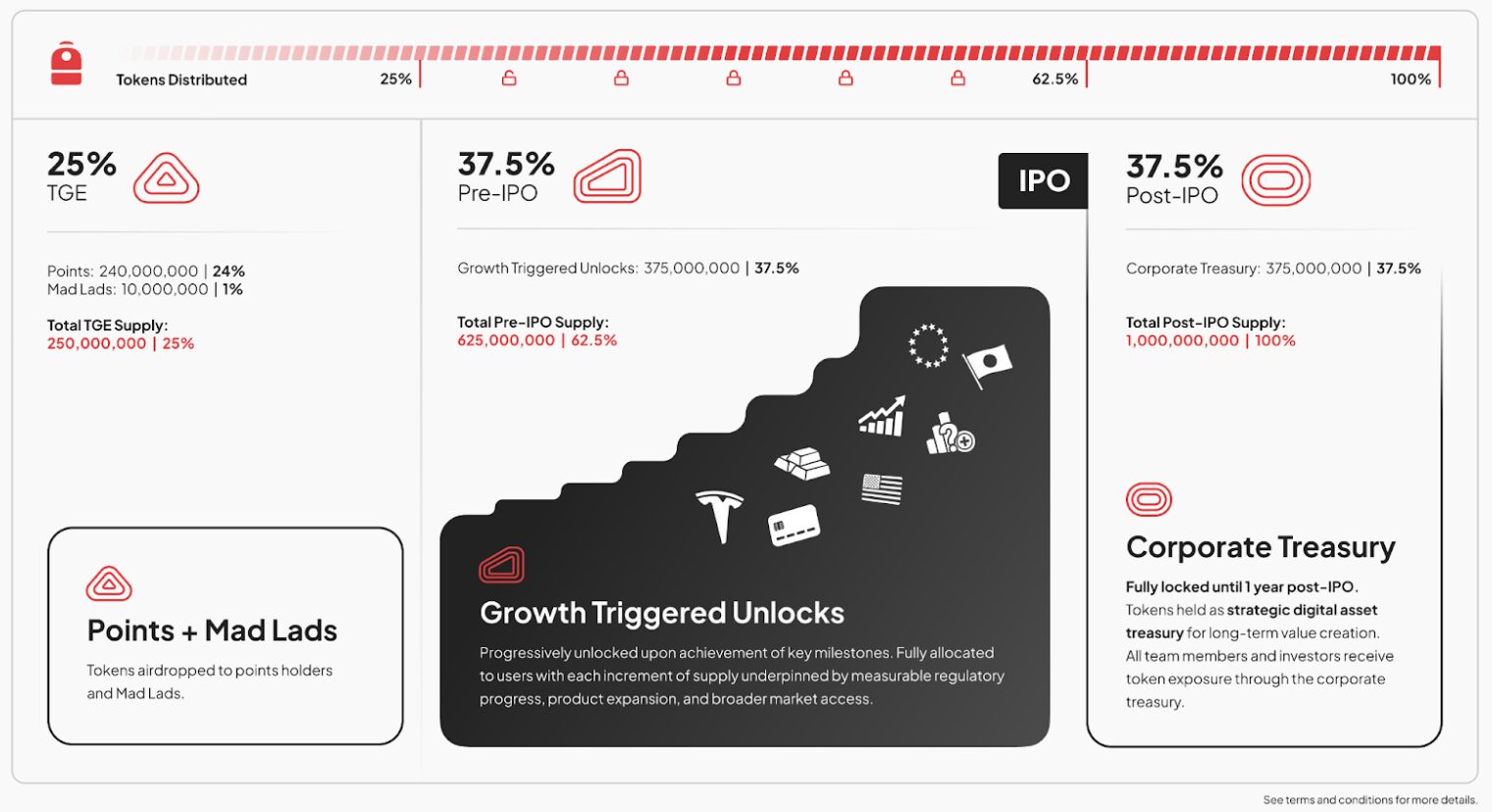 A Backpack tokenek előbb említett, összesen 62,5%-át teljes egészében a felhasználók kapják, míg a fennmaradó tokenek az IPO után kerülnek feloldásra a Backpack csapatának és befektetőinek. A tokenomika célja, hogy megfordítsa azt a modellt, amelyben általában a bennfentesek kapnak nagy korai allokációkat, és az időalapú feloldások kiszámítható eladási nyomást hoznak létre a kiskereskedelmi felhasználókra nézve, akik így a végén ott maradnak magukra a veszteségekkel.