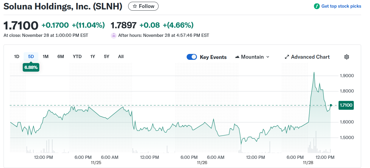 A Soluna Holdings egy Magyarországon kevésbé ismert cég, amelynek székhelye az Egyesült Államokban, Albanyban található. Digitális infrastruktúrával foglalkoznak, amely elsősorban a felesleges megújuló energia számítási teljesítményre alakítását foglalja magában. Ez többek között a Bitcoin-bányászat, a generatív mesterséges intelligencia és a tudományos számítások támogatását jelenti, de van saját bányászati tevékenysége is. A vállalat a NASDAQ tőzsdéjén az SLNH ticker alatt kereskedik, és 2024-ben körülbelül 38 millió dolláros bevételt jelentett.