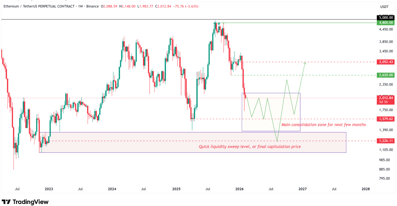 Az időszakok összehasonlítása azt mutatja, hogy az ETH mostani esése hasonlít a 2021–2022-es ciklusban látott mintára. Akkor is először kialakult egy kezdeti mélypont, majd később az ár újra lejjebb ment, mielőtt tartósan emelkedni kezdett. Ebből azt jósolják elemzők, hogy további mélypontok jöhetnek még, mielőtt újabb hosszútávú fellendülés jöhetne. Az elmúlt 7 napban látott, 1800 dollár alá történő beköszönés tehát inkább csak egy mélypont lehet, és nem a végleges piaci támasztási szint. 2021-ben az ETH 12 hónapot töltött konszolidációval az első mélypont (1 730 dollár) és egy jelentős alacsonyabb támasz (885 dollár) körül, ami lehetővé tette a tőkeáttétel visszaállását és a spot kereslet újjáépülését.