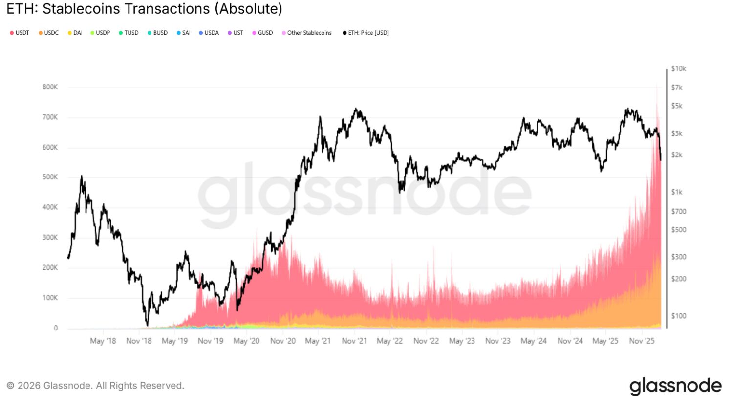 Ami miatt sokan a felpattanásban bíznak hosszabb távon, az a tény, hogy az ár nem tükrözi a hálózat teljesítményét. Az Ethereumon a stabilcoin tranzakciós volumen az elmúlt 18 hónapban mintegy 200%-kal nőtt, miközben az ETH ára körülbelül 30%-kal alacsonyabb maradt. Ez az eltérés parabolikus újraárazást eredményezhet az ether számára.