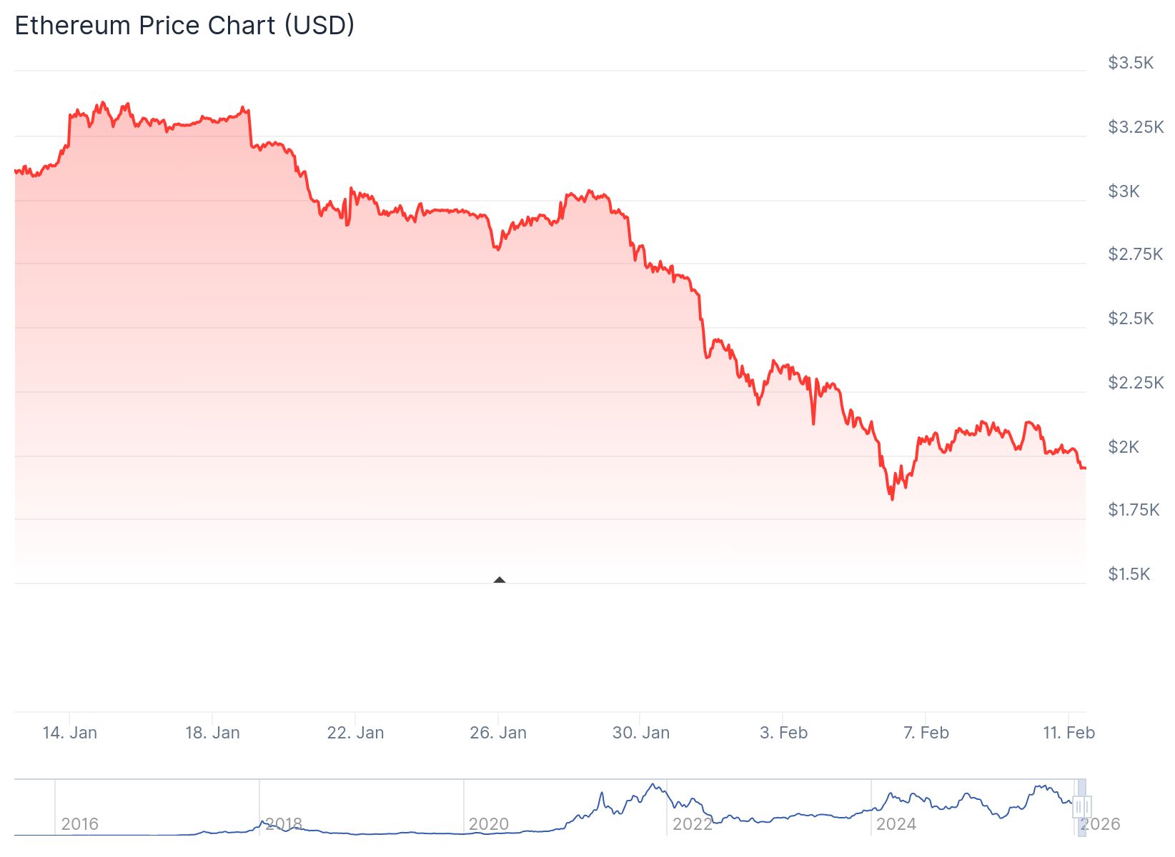 Próbálkozott ugyan az árfolyam február 11-én, de végül az ether ára nem tudta megtartani a 2000 dollár feletti szintet. A cikk írásakor 1947 dollár körül kereskednek egy ETH coinnal, ami 30 nap viszonylatában közel 40%-os esés.