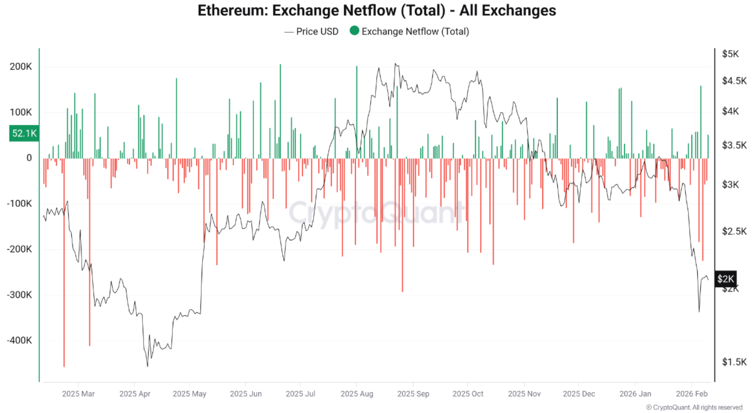 Eközben az ether kiutalások a tőzsdékről október 2025 óta a legmagasabb szintjükre ugrottak, a nettó kiáramlás meghaladta a 220 000 ETH‑t. A Binance még múlt héten, február hatodikán napi nettó 158 000 ETH kiáramlást rögzített, ami a legnagyobb augusztus 2025 óta.
