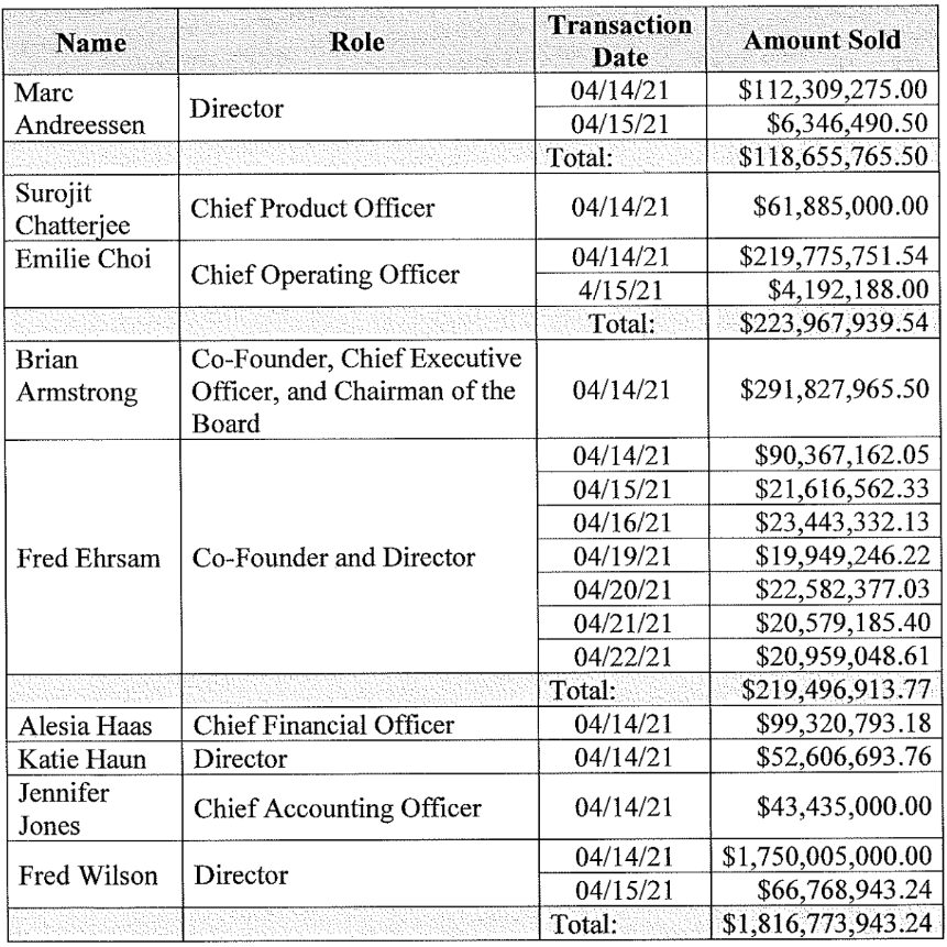 Andreessen, aki 2020-ban csatlakozott a Coinbase igazgatóságához, állítólag körülbelül 118,7 millió dollár értékben adott el részvényeket az Andreessen Horowitz nevű befektetési cégen keresztül. A felperes azt állítja, hogy az igazgatók tudták, hogy a Coinbase értékelése túlzottan magas, és részvényeket adtak el, hogy elkerüljék a későbbi veszteségeket. Az igazgatósági tagok azt állítják, hogy nincs bizonyíték arra, hogy olyan információ lett volna a birtokukban, ami nem lett volna nyilvános.