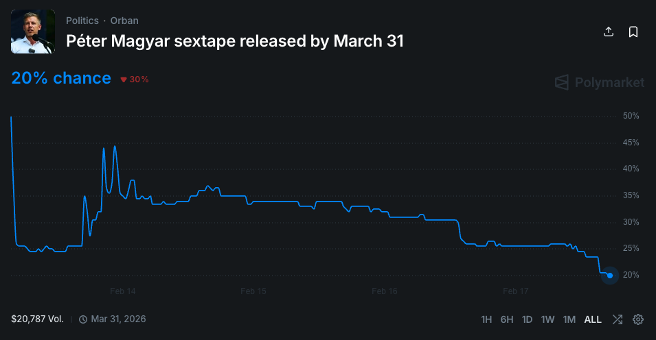 A kriptós előrejelzési piacok világában ritkán fordul elő, hogy egy magyar belpolitikai szereplő köré külön eseménypiac épül. A Polymarket felületén azonban jelenleg is fut egy olyan piac, amely arra vonatkozik, hogy nyilvánosságra kerül-e Péter Magyarról egy állítólagos szexvideó 2026. március 31-ig. A piac nem a botrány tényét állítja, hanem annak bekövetkezési esélyét árazzák a kereskedők – kriptovalutában.