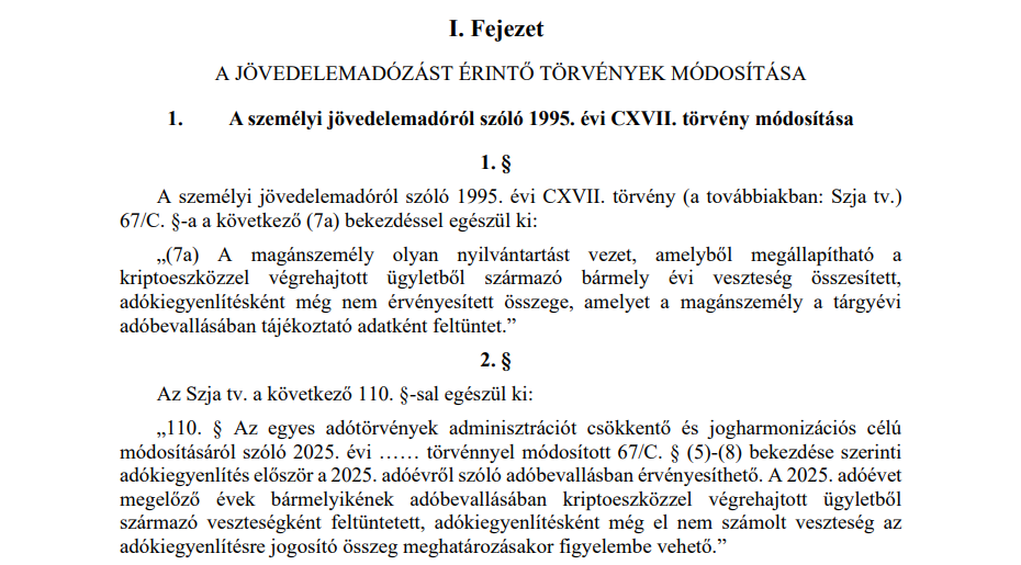 2025 októberéig Magyarországon a kriptovaluta-ügyletekből származó jövedelmeket a személyi jövedelemadóról szóló törvény 67/C paragrafusa szabályozza, amely 15%-os adókulcsot ír elő, és biztosítja az adókiegyenlítés lehetőségét az ügyleti veszteségek beszámítására az elmúlt két év vonatkozásában. Ez a szabályozás már jelentősen kedvezőbb, mint a korábbi, magasabb adóterhek voltak, és a magánszemélyeknek lehetőségük volt az adóév során és az azt megelőző két évben keletkezett veszteséget figyelembe venni. Valamint a magánszemélyek kötelesek külön nyilvántartást vezetni a kriptoügyleteikről.