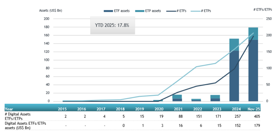 Miután az Egyesült Államokban 11 bitcoin ETF kérelme viszontagságos körülmények között, de elfogadásra került, elkezdődött az intézményi tőke milliárdos beáramlása a kriptovalutákba, melyre vállalatok, nyugdíjkezelők és konzervatív befektetők is felkapták a fejüket. Napjainkra nagyjából 180 milliárd dollárnyi tőke áll különböző globálisan listázott kriptovaluta ETF-ekben, melyek kétharmadát az amerikai piac teszi ki, ugyanakkor azeurópai piac is eléri a 20-30 milliárd dolláros méretet.