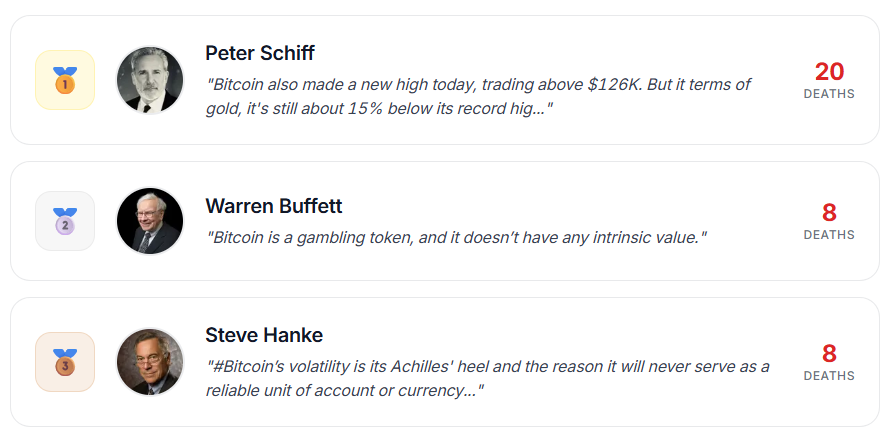 Ez a vizuális idővonal jól megmutatja azt az extrém volatilitást, amely a Bitcoin teljes történetét meghatározta. A 1–10 dolláros korszakban megjelent korai összeomlás-jóslatoktól kezdve a 3000, 30000 és 60000 dollár körüli árfolyamok kapcsán írt tucatnyi nekrológig, a grafikon rávilágít arra, hogy a közvélemény milyen gyakran értelmezte félre a hosszú távú elfogadás tendenciáit. Az oldal azt is megmutatja, hogy kik voltak a Bitcoint legtöbbször temető személyek, publicisták befektetők. Az első helyen ezen a listán a Bitcoint már 20 alkalommal temető BTC-kritikus aranypárti Peter Schiff áll, megelőzve a hagyományos pénzügyi piacok legendás befektetőjét, Warren Buffetet, valamint Steve Hanke amerikai közgazdászt, a dollarizáció egyik fő szószólóját.