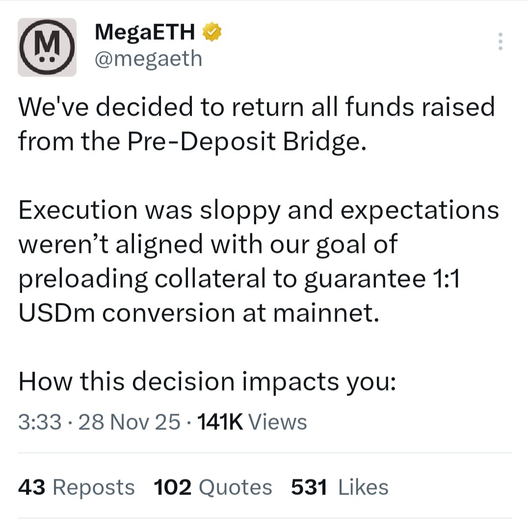 A MegaETH csapata hivatalosan is bejelentette, hogy visszatéríti az összes eddigi befizetést, melyet az előértékesítési kampányban gyűjtött össze – több mint 400 millió dollárt. A döntés a kaotikus keddi események után született meg, ahol leállások, multisig-tranzakciók meghibásodása, valamint limitváltoztatások nehezítették meg a rendszer működését.