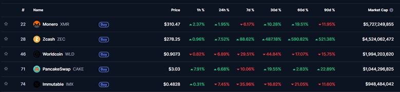 Nem rég írtunk a Zcash-sel kapcsolatban , amikor a kriptovaluta egy hónap alatt 280%-ot emelkedett. A lendület pedig nem hagyott alább, a Zcash (ZEC) az 5 legnagyobb privacy token közül messze kiemelkedik napi, heti és havi hozamok tekintetében, különösen a negyedéves +521%-os növekedésével.