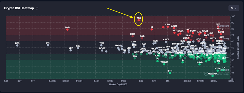 Ezt mutatja is az alábbi mátrix, ahol első körben a kriptovaluta piaci kapitalizációját látjuk (X tengely – csökkenő sorrendben), míg az Y tengely az adott token 7 napos RSI-jét hivatott mutatni.
