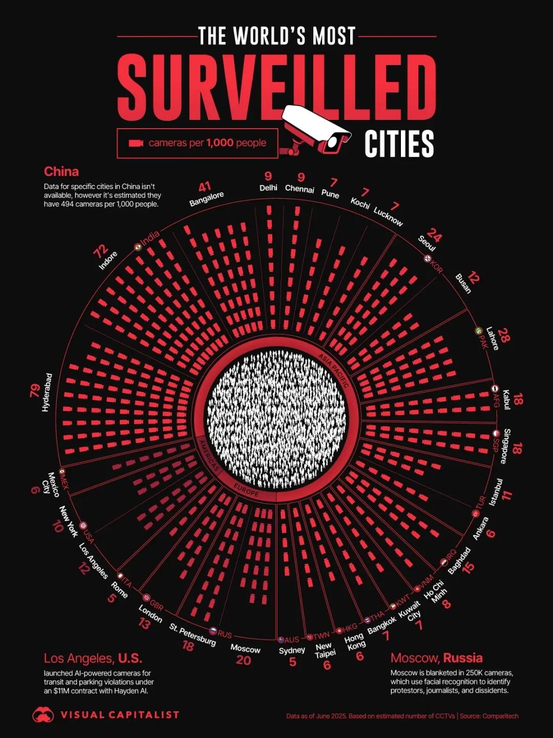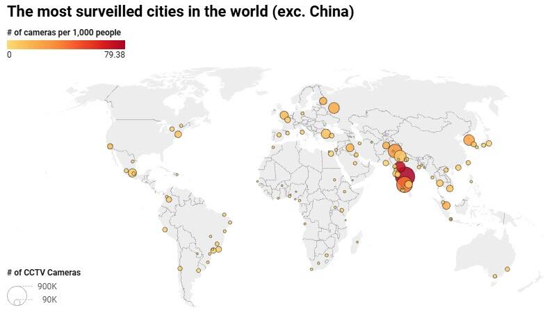 A világban egyre gyorsabban terjednek a megfigyelőkamerák. Bár a pontos számot szinte lehetetlen meghatározni, az IHS Markit becslése szerint világszerte már körülbelül egymilliárd térfigyelő kamera működik. A Visual Capitalist a Comparitech adatai alapján azt vizsgálta, hogy a nagyvárosokban ezer lakosra vetítve hol a legsűrűbb a kamerák jelenléte.