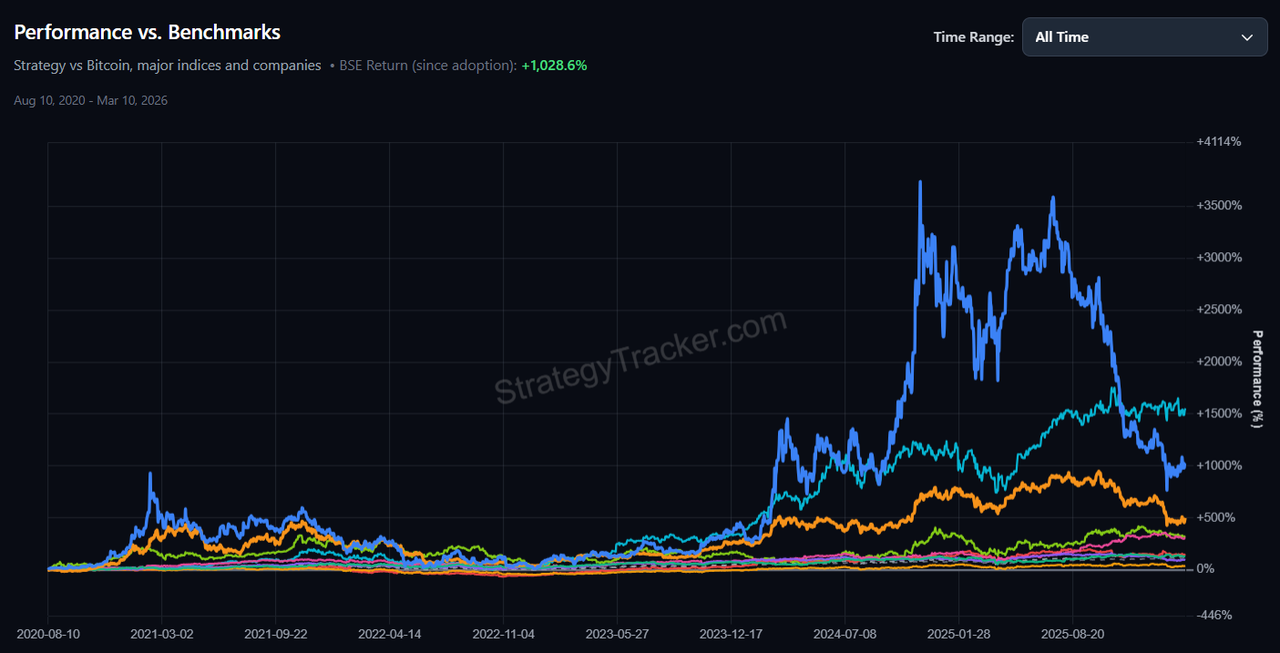 Felfelé viszont továbbra is él a felerősítés. Február 5. és március 6. között az MSTR ára nagyjából 44%-ot emelkedett a tartományán belül, míg a Bitcoin csak 15%-ot. Ez közelebb áll a 3-szoros szorzóhoz. Ez azt jelenti, hogy az MSTR a Bitcoin esésének kevesebb mint a felét nyelte el, miközben 738 731 BTC‑t tart a könyveiben, ami jelenlegi árakon körülbelül 51,1 milliárd dollárt ér. Összehasonlításképp, a Microsoft év eleje óta 14%-ot esett, a Tesla 12,60%-ot, az Amazon 8,14%-ot. Az S&P 500 és a Nasdaq‑100 is mínuszban van (a sötétkék a diagramon az MSTR, a világoskék az Nvidia, a BTC pedig a narancssárga):