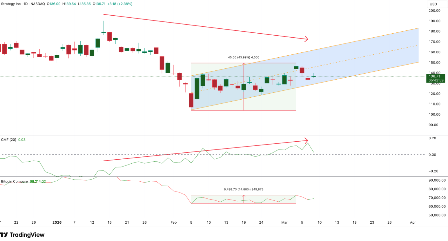 A Strategy részvénye jobban teljesít, mint a nagy részvények többsége, annak ellenére, hogy egy olyan eszközt tart, amely idén több mint 20%-ot esett. És ezt a befektetők is észrevették. A Chaikin Money Flow (CMF) február 25. körül átlépte a nullavonalat, és tovább emelkedett, még akkor is, amikor a Strategy részvényárfolyama január közepe óta csökkenő trendben volt. A CMF egy pénzáramlás‑indikátor, amely azt mutatja, hogy a nagybefektetők inkább vásárolnak vagy inkább eladnak egy adott időszakban. A csökkenő ár és az emelkedő CMF közötti divergencia arra utal, hogy nagyobb szereplők építettek pozíciókat kedvezményes szinteken.