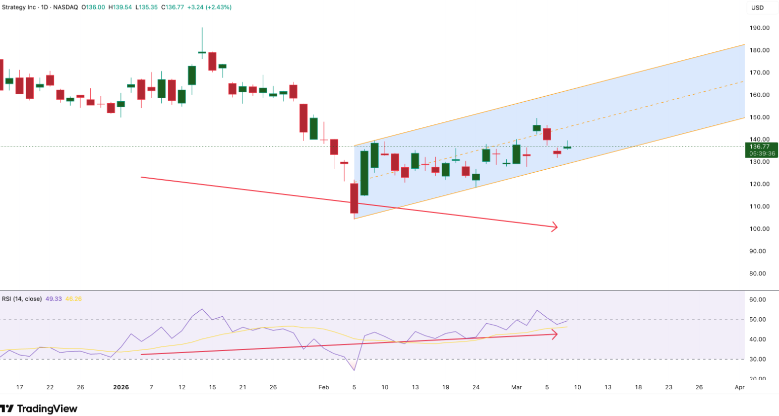 Összességében tehát 2026-ban eddig az MSTR lassabban esett, mint a Bitcoin, de gyorsabban emelkedett, mint a legnagyobb kriptovaluta, így a Strategy még több BTC-t tudott venni és az STRC fedezeti aránya javult. Viszont vannak azért kritikus pontok is. Január eleje és március eleje között az árfolyam alacsonyabb mélypontokat alakított ki, miközben az RSI (relatív erősségi index) magasabb mélypontokat mutatott. Ez egy klasszikus emelkedést jelző divergencia, amely március 6‑ig aktív volt. Ez azt jelzi, hogy bár az ár még esett, a lefelé irányuló lendület gyengült és a vevők aktívabbak voltak.