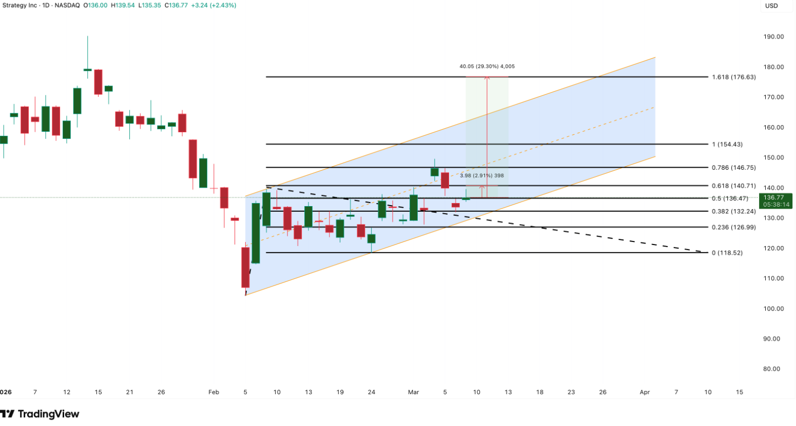 Az MSTR továbbra is egy emelkedő csatornában mozog, és a fontos Fibonacci‑szintek határozzák meg, merre mehet tovább az ár. A 140 dollár feletti zárás erős kitörést jelentene, míg a 136 alatti letörés gyengülést. Ha az ár nap végén 140 dollár felett zárna , az kitörést jelentene, és megnyithatná az utat akár 176 dollárig is. A felfelé irányuló 3× béta miatt ehhez a Bitcoin részéről elég lenne kb. 10% emelkedés. Ha az ár 136 alá esik, akár a csatorna aljáig, 118 dollárig is eshet a részvény. A 2026‑os béta alapján az MSTR lefelé továbbra is csak kb. 0,4×‑es érzékenységet mutat, vagyis a Bitcoin esésének kevesebb mint felét követi. Ha a Bitcoin tovább esne, az mNAV újra 1.0x alá kerülne és ismét kedvezményes BTC‑vételi lehetőség nyílna az MSTR részvényen keresztül.