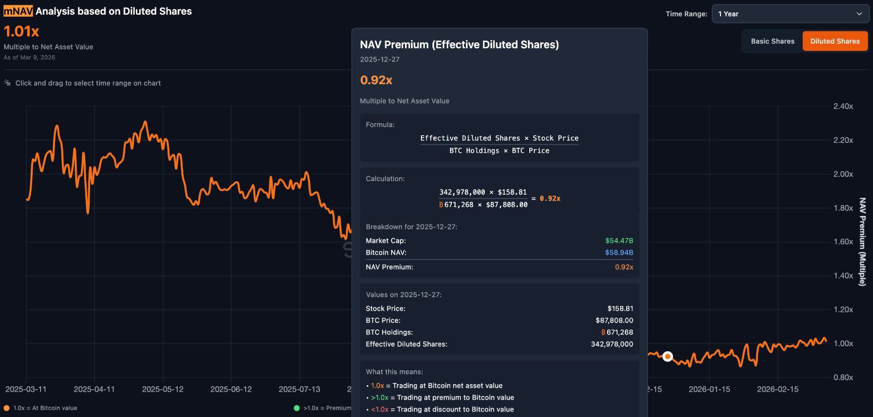 Most azonban a CMF csökkenni kezdett, ami elvezet a következő ponthoz. Az mNAV, vagyis a nettó eszközértékhez viszonyított szorzó azt hasonlítja össze, hogy a Strategy piaci kapitalizációja hogyan viszonyul a birtokolt Bitcoin‑állománya értékéhez. A hígított képlet a hígított részvényszámot osztja a BTC‑állománnyal, majd megszorozza a BTC árával. Az 1,0x alatti arány azt jelenti, hogy a részvény olcsóbb, mint a mögöttes Bitcoin.