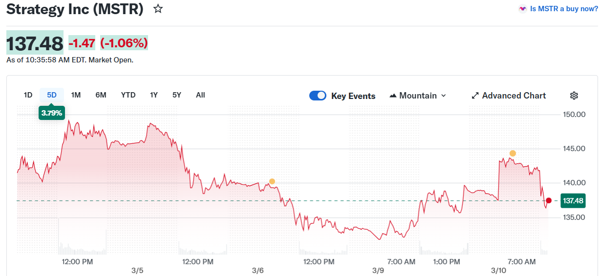 A MicroStrategy részvényének árfolyama az elmúlt öt napban nagyjából stagnáló teljesítményt mutatott, kisebb esések és emelkedések után, aktuálisan 137 dollár környékén kereskednek vele. Ez egy hét viszonylatában 2,5%-os emelkedést jelent. A cég épp most jelentett be egy újabb, 17 994 BTC‑s vásárlást 1,28 milliárd dollár értékben, de ez nem nagyon rengette meg az árat.