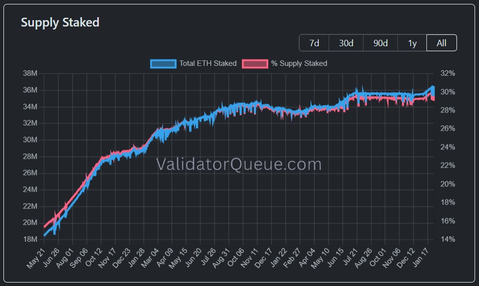 A Validator Queue láncon belüli adatai szerint a lekötött ETH mennyisége meghaladta a 36,6 millió darabot, ami nagyjából a teljes kínálat 30,13%-ának felel meg. A növekedés mögött egyre hangsúlyosabban jelennek meg az intézményi szereplők: vállalati kincstárak és tőzsdén kereskedett alapok is aktívan alkalmazzák ezt a fajta lekötési stratégiát, elsősorban hozamtermelési és hálózatbiztonsági megfontolásokból.