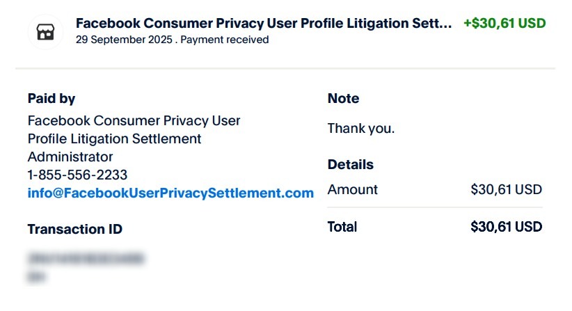 A fenti képen jól látszik, hogy 2025 szeptember végén közel 10 ezer forintos kompenzációt kaptam a Metatól az adatszivárgás miatt, melyet az előzetesen megadott Paypal fiókomra utaltak.