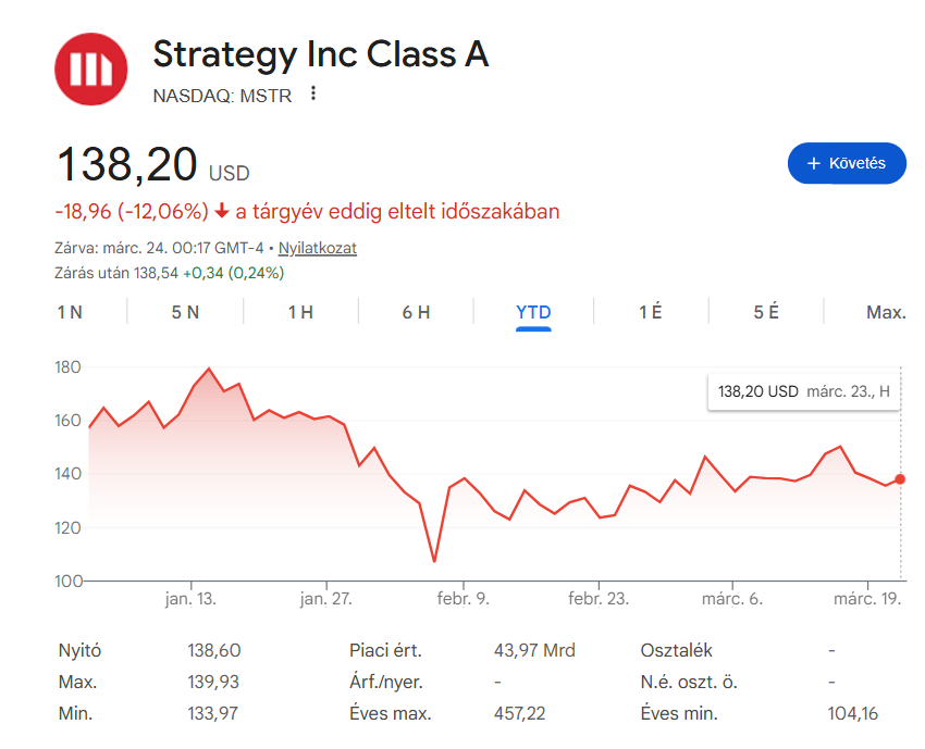 A Strategy Nasdaqon kínált részvénye, az MSTR, jelenleg 138,20 dolláron kereskedik, idén azonban több mint 12%-ot vesztett már az árfolyamából, és jelentősen elmarad a tavaly látott 450 dolláros csúcstól is. Ennek az az oka, hogy a részvény leginkább úgy viselkedik, mint egy tőkeáttételes bitcoin ETF, árfolyamát pedig a globális makrogazdaság mellett a bitcoin árfolyama is befolyásolja – amely látott már szebb napokat.