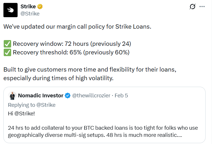A szabálymódosítást a felhasználói visszajelzések ösztönözték, mivel sokan úgy vélték, hogy a korábbi 24 órás reagálási idő margin call után túl szűkös volt azok számára, akik többaláírásos tárcákat használnak. A Strike szerint az újítás célja nagyobb rugalmasság biztosítása, különösen a kriptopiac fokozott volatilitása idején. A bejelentés alkalmával a Strike hangsúlyozta ismét, hogy a margin call nem jelenti a likvidációt.