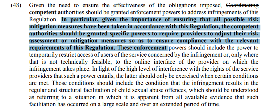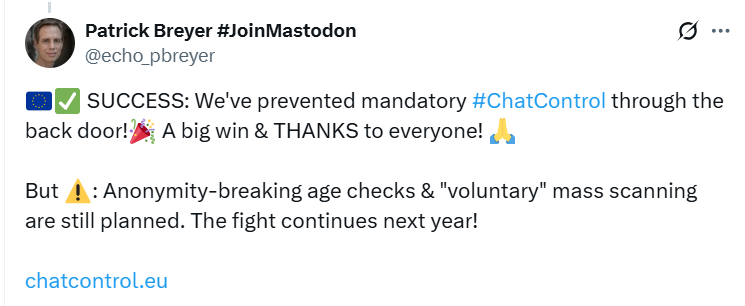 A dán EU-elnökség idején került be a vitatott rész, de most egy új sor hozzáadásával megoldották a problémát, vagyis már nem kötelező a kliensoldali üzenetszkennelés. Ez a mondat gyakorlatilag arról szól, hogy a rendelet egyetlen rendelkezése sem értelmezhető úgy, hogy az felderítési kötelezettséget jelent a szolgáltatók számára. Eddig ugyanis a a tervezet elég homályos nyelvezettel utalt „minden lehetséges kockázatcsökkentő intézkedésre”. Ez lehetővé tenné a hatóságok számára, hogy a szolgáltatókat a csevegés szkennelésének bevezetésére kényszerítsék, főleg, hogy a csevegés szkennelésének infrastruktúrája már megvan az önkéntes bevezetéshez. Breyer posztja néhány nappal azután érkezett, hogy november 11-én még legmagasabb szintű politikai megtévesztésnek nevezte azt, hogy bár látszólag enyhítettek a megfigyelési követelményeken (kevesebb kötelező szkenneléssel), valójában a háttérben egy sokkal veszélyesebb, átfogóbb megoldást csempésztek vissza.
