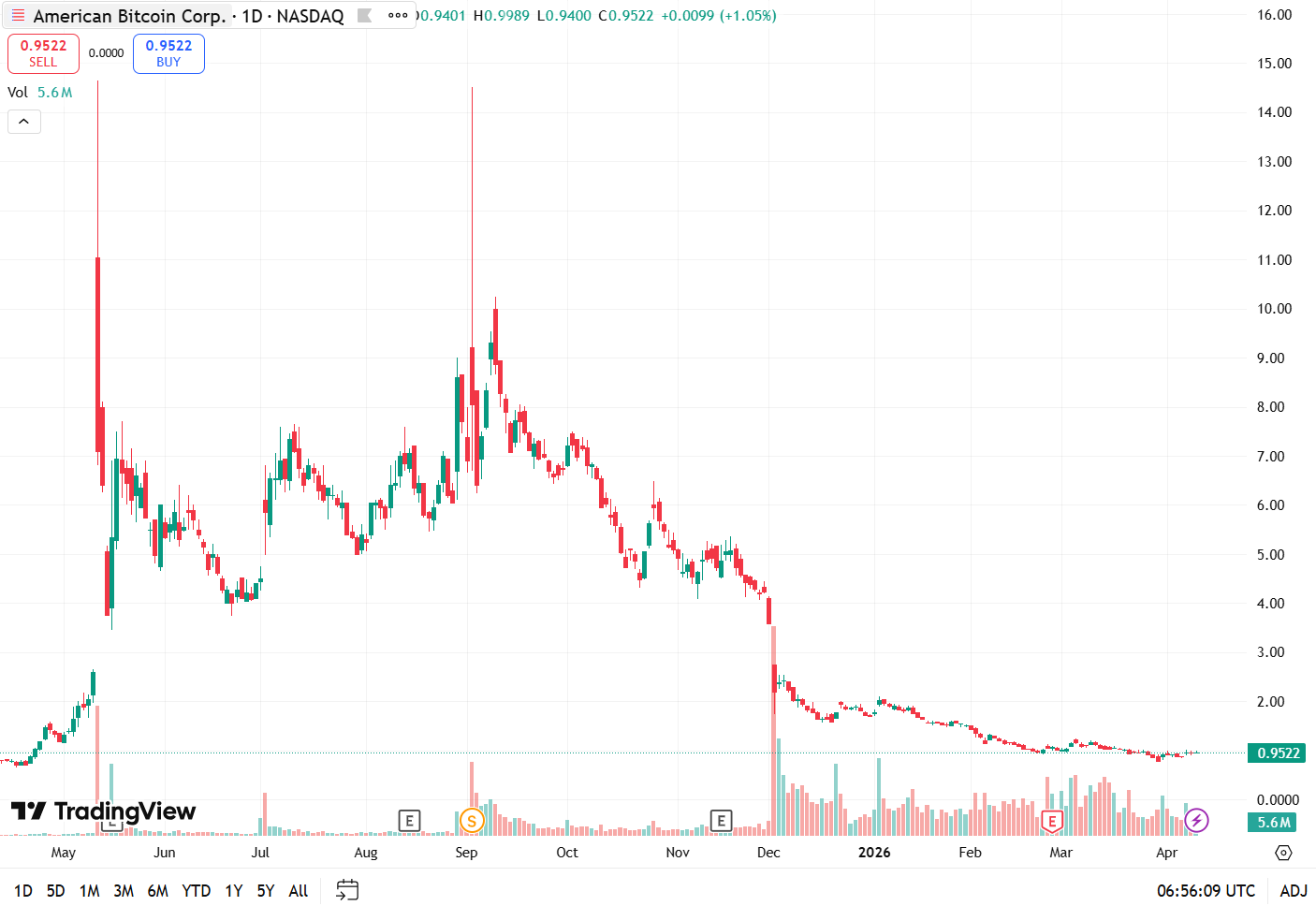 Az American Bitcoin Corp. a Nasdaq tőzsdén nyilvánosan forgalmazott bitcoin bányász és treasury cég, amely 2025. szeptember 3-án lépett a piacra a Gryphon Digital Mininggel végrehajtott teljes részvényösszeolvadás révén. A részvények ára 9 dollár felett nyílt, 2026 áprilisára pedig 0,90 és 1,00 dollár között forgott, ami nagyjából 84%-os csökkenést jelent a tőzsdei bevezetés utáni csúcsokhoz képest, piaci kapitalizációja pedig most 1 milliárd dollár alatt van.