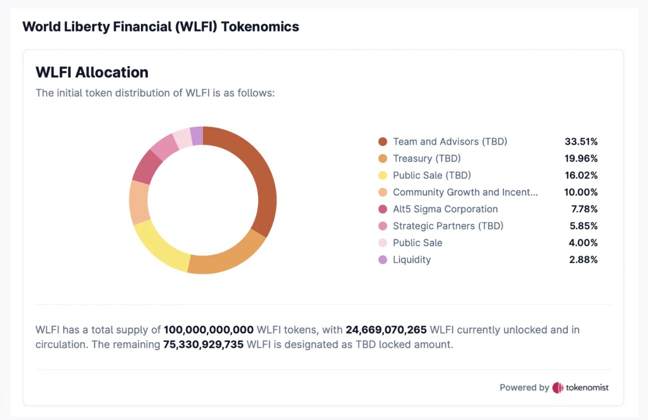 A WLFI fix 100 milliárd tokenből álló készlettel rendelkezik, amelyből jelenleg nagyjából 24,67 milliárd van forgalomban, a fennmaradó 75,33 milliárd pedig még mindig zárolva van. Az allokáció nagyrészt a bennfentesek és a tartalékok felé irányul, 33,51%-ot a csapat és a tanácsadók, 19,96%-ot a kincstár, 16,02%-ot pedig nyilvános értékesítésre szánnak.