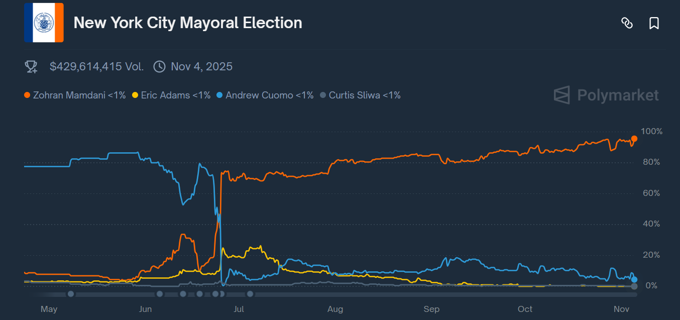 A híres decentralizált előrejelzési piacot ellepték a fogadók a 2025-ös New York-i polgármester-választás miatt. A Polymarketen a fogadók tömegesen fogadtak Zohran Mamdani és Andrew Cuomo közötti kiélezett versenyre. A platform szerint a felhasználók kezdetben Andrew Cuomo győzelmét várták, de a botrányokból és a kiélezett versenyből végül Mamdani emelkedett ki. Júliustól kezdve a fiatal szocialista jelölt győzelmére a Polymarket fogadói 72%-ot adtak, az esélye pedig hónapról hónapra kúszott felfelé.