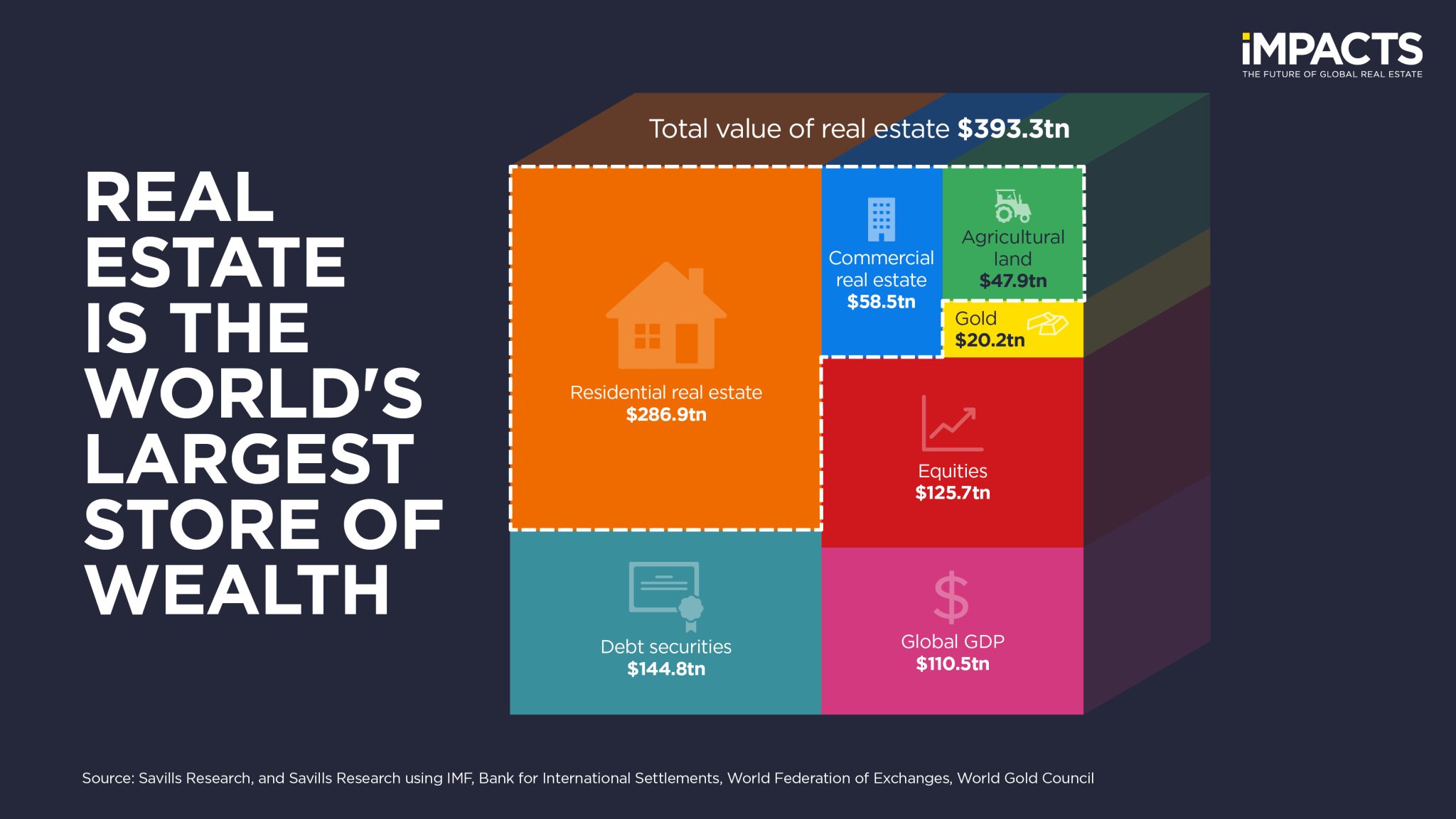 A másik nagy eszközkategória az ingatlanok, amelyekbe a lakóingatlanok és kereskedelmi ingatlanok is beletaroznak. Az ingatlan valójában a világ legnagyobb eszközosztálya, amelynek értéke globálisan nagyjából 370–400 billió dollár közé tehető a Salis becslése szerint..