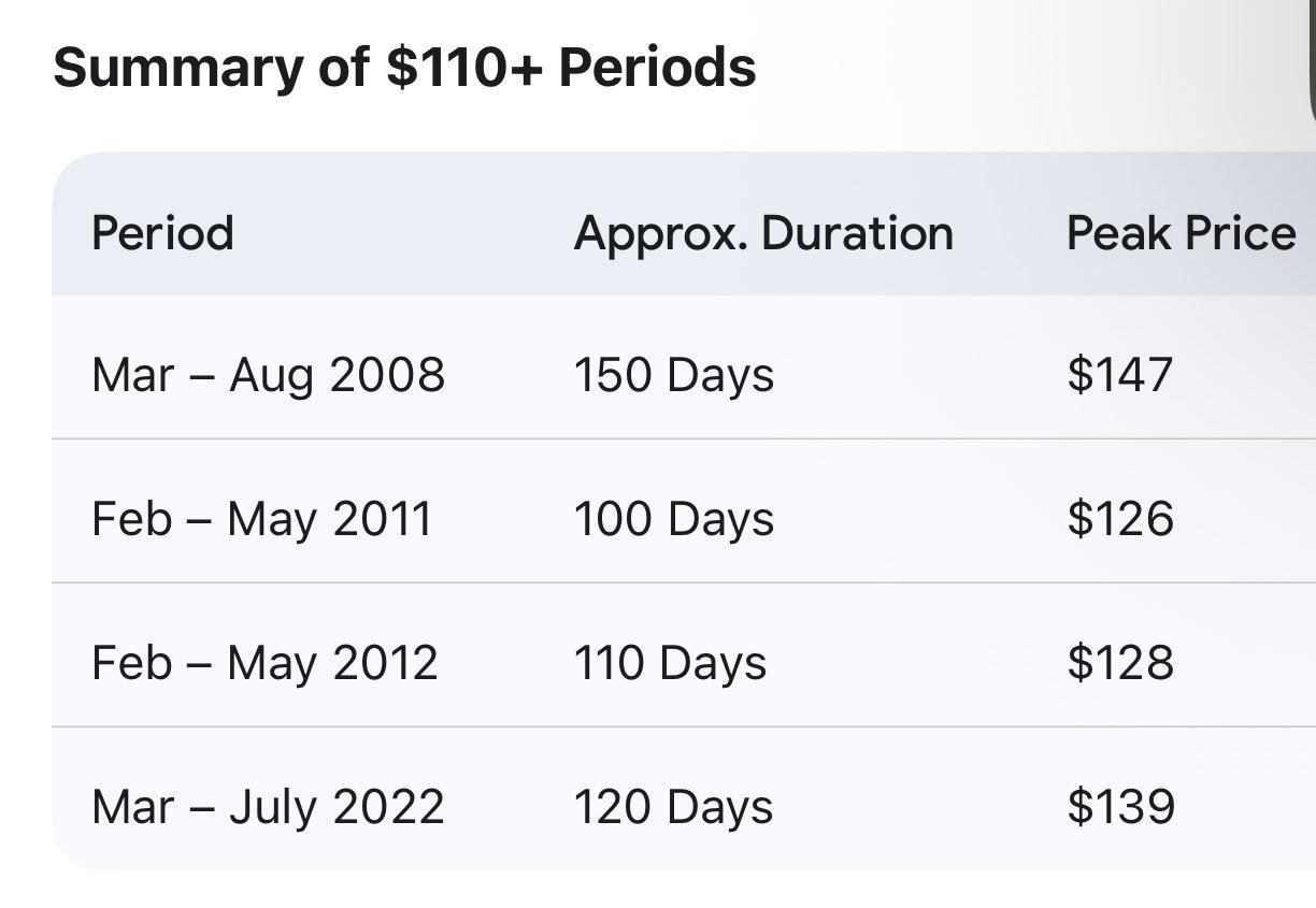 A csatolt ábra jól mutatja, hogy a 110 dollár feletti olajárak a múltban mindössze néhány hónapig tartottak ki: 2008-ban, az utolsó nagy válságkor nagyjából 150 napig, 2011-12-ben kevesebb mint négy hónapig, legutóbb, 2022-ben az orosz-ukrán háború kirobbanásakor pedig kicsivel több mint négy hónapig.